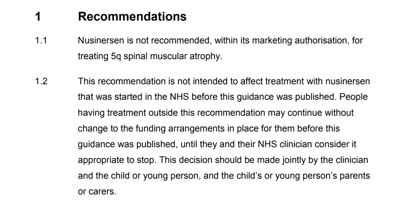 The decision to stop should be made jointly by the clinician and the child or young person, and the child’s or young person’s parents or carers. It would be unethical to withdraw treatment from patients who have already started a treatment plan on nusinersen, even if the final guidance is a negative one.