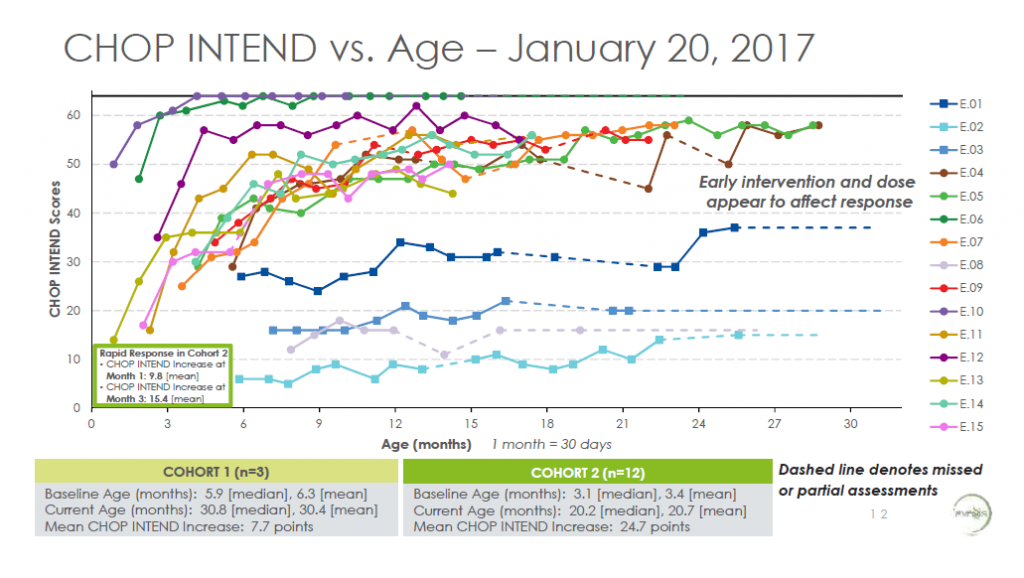 As can be seen on the chart above, the three children on lower dose remained stable since the injection. On the other hand, those who received higher dose witnessed dramatic improvement of muscle function. After 18 months from injection, the strongest two SMA 1 children could walk and run independently and most of the remaining ones were able to sit without support. The video below, published in October 2016, shows the changes after AVXS-101 treatment: